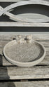 A charming heart-shaped bird bath with one bird sitting on top, perfect for holding water or bird feed. A lovely addition to any garden.