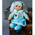 This blonde ragdoll is a picture in her all-blue outfit! She wears her hair in bunches with blue bows and her sky-blue dress has a white collar and a lace trim on the hem. Her sweet little blue cord jacket is appliquéd with felt birds and she has blue strappy shoes.